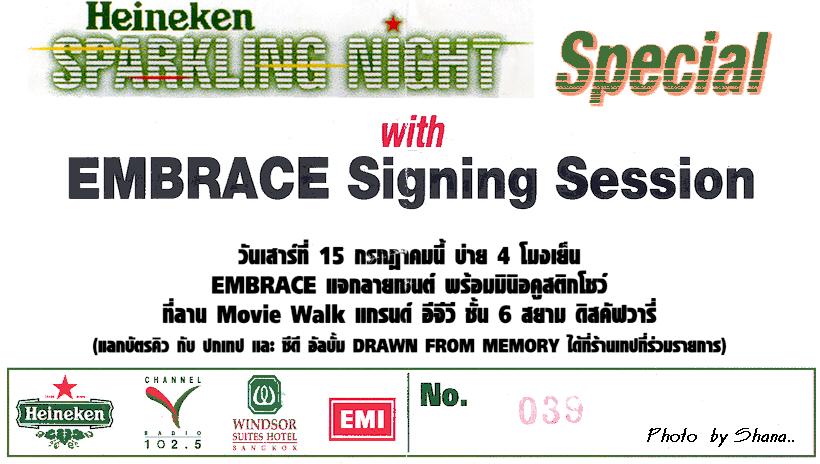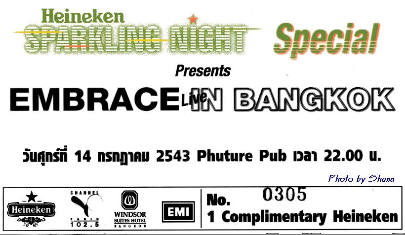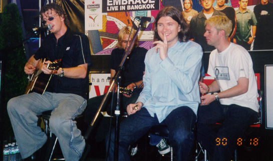 In the year 1999 one day i was in Kitchen cleaning my dishes (oh,,yeah,, my story with EMBRACE always happened in Kitchen hehe) I heard 'Hooligan' but i never have a clue with Richard's voice i just thought 'This song is lovely,,' and when DJ said 'This is new single from EMBRACE....' i dropped dishes and ran to Radio and asked 'What? Tell me i heard the real thing!',,,hehe I know Radio can not speak. After heard that i alway phoned to radio station and asked for Hooligan every DJ,, that day i heard of Hooligan for about 5 times !!! When "You're Not Alone" out and went to No.1 I can't explain the feeling but i felt really really glad.Oneday in the afternoon Joey (DJ)said'Next week we have Richard McNamara from Embrace here ,,phone interview from the UK,,,don't miss' OOhh,, i can't believe my ears , i can't ,, sure i didn't missed that interview,, Embrace seem so huge in Thailand. When 'You're Not Alone' was in No.1 for 5 weeks and 'Save Me was in no.3 i heard DJ said"Embrace are coming to BKK soon.' OHHHH finally finally,, my dream is coming true!!!!!!!!!!!!!!!! Well after that CVR gave the tickets to EMBRACE fans ,, i tried lots of DJs but i was susseed with 'Julie' when she asked the question you know i was the first line and she asked 'Which Embrace songs reminded Football Fans in Euro2000?' And i replied 'Champione 2000' (OH,,What's a shamed!!!) She said 'Are you confusing something?' So i knew that i was the fool!!!(hehe) so i told her "OH,,wait,,wait,, Embrace's song right? ,,now i know Hooligan!!!" and she said "Yeah!" then i've got one pair of ticket!! Oh,,, i can't believe that!!! And the night was come and i felt so glad>>>>>>